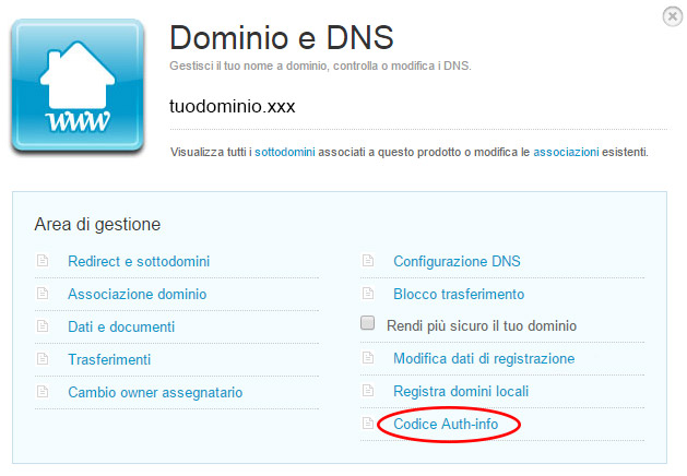 - Per fare il trasferimento del dominio ti servirà il codice AuthInfo che trovi nel tuo account di Register. Il codice AuthInfo è un codice che soltanto i proprietari del dominio possono richiedere ed è un codice di tipo alfa-numerico: